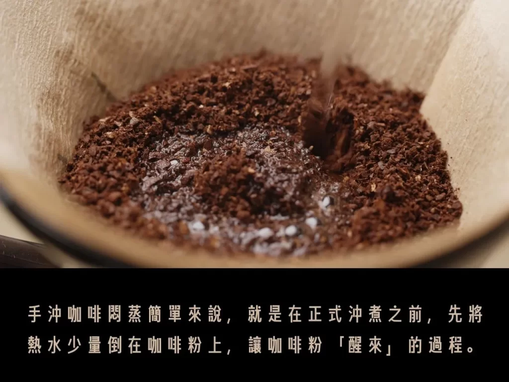 手沖咖啡悶蒸簡單來說,就是在正式沖煮之前,先將熱水少量倒在咖啡粉上,讓咖啡粉「醒來」的過程。