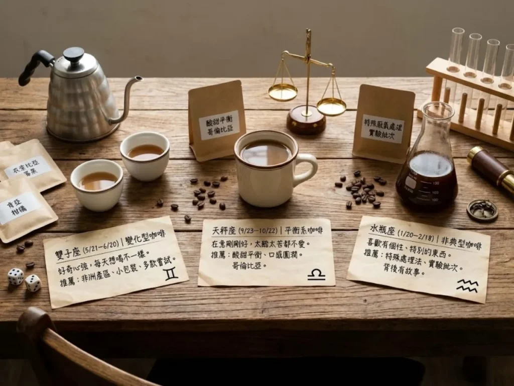 | 水瓶座 | 非典型、創意 | 特殊處理、實驗型 | 厭氧處理豆 | 淺焙~中焙 | 特殊香氣、創新 |